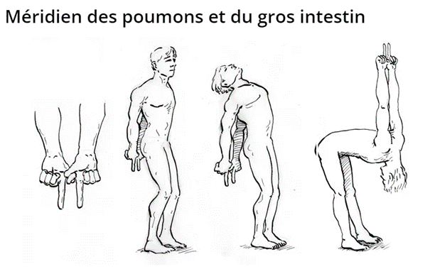 Pour faire face à ces désagréments, il faut stimuler l’énergie du Poumon et du GI grâce à des exercices de respirations et aux sports qui vont activer la respiration profonde comme courir, nager ou de longues marches en forêt. De même, la méditation (aide au lâcher prise), les étirements de méridiens (voir ci-dessous), recevoir des soins shiatsu, pratiquer le DO-IN ( automassage des méridiens) et l’alimentation incluant la saveur piquante sont de précieux soutiens. Il va de soi que diminuer le tabagisme est une aide inestimable également.